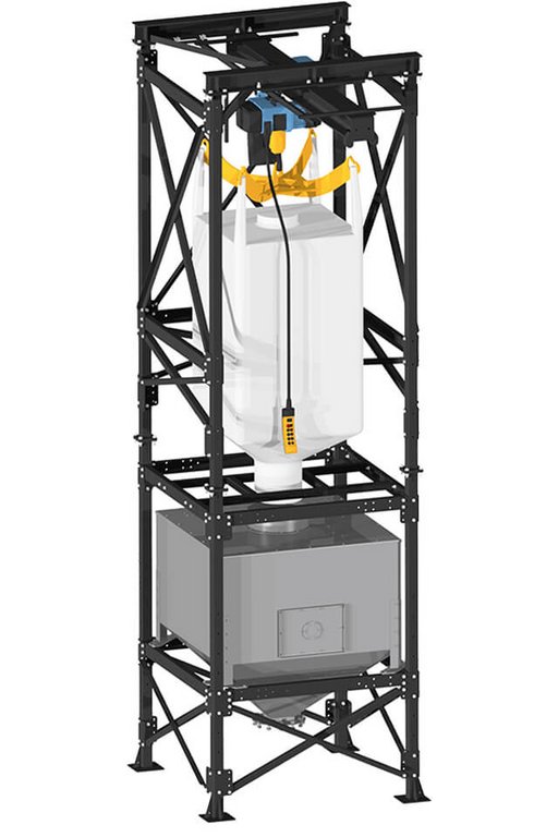 This big bag emptying station is only suitable for free-flowing granules. The big bag can be conveniently attached to an electric crane. The 2000-l container is dimensioned to be able to hold a complete big bag.