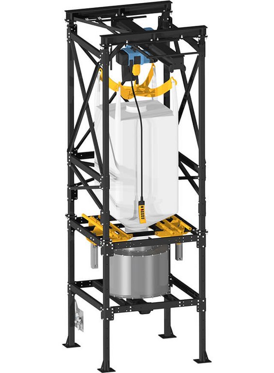 This big bag emptying station was designed specifically for the storage and discharge of PET flakes. The big bag is conveniently attached to an electric crane. A shaking device loosens the PET flakes with oscillating movements and ensures that they are discharged from the big bag without any problems. On the flat bottom of the container, an rotary bin discharger clears and doses the PET flakes into the discharge opening.