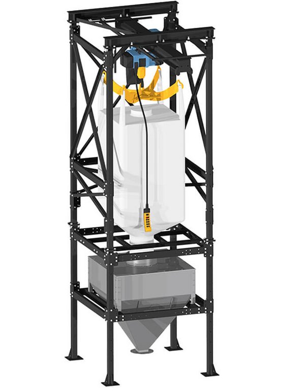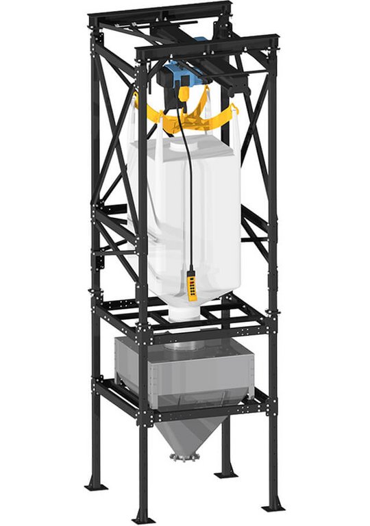 This big bag emptying station is suitable for free-flowing regrind and granules. The big bag can be conveniently attached to an electric crane.