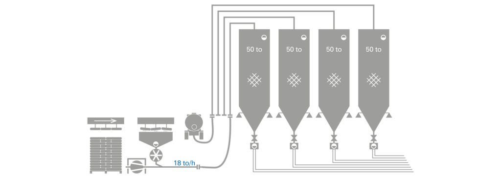 I veicoli commerciali pesanti con un carico di 25 t di materie prime in sacchi su palette vengono scaricati con carrelli e i sacchi vengono condotti a una macchina svuotatrice completamente automatica e svuotati. Offriamo il sistema di trasporto idoneo per la movimentazione in condizioni di massimo rispetto del vostro pregiato materiale sfuso nei nostri sili flessibili. Questi possono avere una capacità ricettiva di due veicoli commerciali pesanti (50 t).